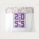 Créez des souvenirs durables avec un appareil photo et votre tapisserie de typographie sportive de la promotion de ____ ! Fond blanc, typographie violette, année personnalisable et en-tête de faux confettis violets et or en haut.