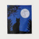 Tapisserie dans une silhouette de chat, regardant une pleine lune dans un ciel étoilé bleu profond