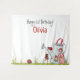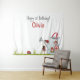 Tapisserie joli, girly et personnalisée, 1er anniversaire heureux; avec une adorable fille coccinelle assise sur balançoire, qui est accroché à une adorable arrosage de jardin peut maison, deux coccinelles supplémentaires se joignent à cette scène fantasque et magique de fête de jardin. Personnalisez ce magnifique décor de fête d’anniversaire avec le nom de la fille et la personnaliser d’accueil selon vos besoins.