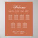 Un simple tableau de sièges mariage avec 7 tables. L'arrière - plan est en terre cuite (marron), le texte est blanc. Le mot Bienvenue dans la partie supérieure et les noms de la mariée et du marié sont écrits dans un élégant script calligraphique, le reste en casquette.
