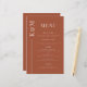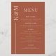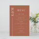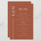 Elégante liste de menu de dîner de mariage avec une ligne simple et propre avec la première du couple sur le côté. L'arrière - plan est en terre cuite.