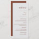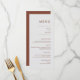 Ce design de menu simple et élégant comprend une typographie sans serif minimaliste moderne, des couleurs bohème magnifiquement rustiques qui ne fournissent que l'information qui sert un but. Réunissez vos proches autour d'un beau repas avec notre collection chic et simple en terre cuite toscane.