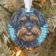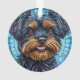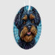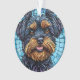 Illustration numérique colorée d'un terrier aux yeux bruns foncés expressifs et à la fourrure vibrante, entouré d'un arrière-plan décoratif de style mosaïque. Représente la loyauté, le charme et une expression artistique du design canin.