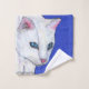 Ce linge a la tête et le visage d'un chat blanc avec les yeux bleu vif sur un arrière - plan bleu vif profond avec de minuscules éclats comme des points blancs.