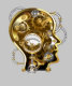 Tête conceptuelle, mécanique, humaine avec manomètre antique et engrenages métalliques contre arrière - plan industriel gris. Style Steampunk.