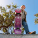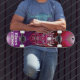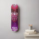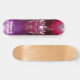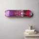 Skateboard de marque Dd, avec une œuvre graphique représentant une tête de robot métallique rouge et violet avec des courants électriques qui montent et descendent. Texte personnalisé, en bas du plateau, est prêt à être personnalisé pour dire ce que vous voulez.