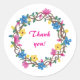 Thank you is printed in the center of a colorful floral wreathe, on custom stickers. The flowers are pink, yellow, and blue, and are on a brown vine. The text can be customized on the template form. Thank you for shopping at CherylsArt on Zazzle.