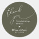 Modern Wedding minimalist "Thank You for celebrating with us" Cookies and Gifts Round Sticker, in romantic script, little heart, with bride and groom signature and wedding date, olive green theme wedding favors label.