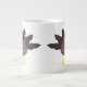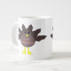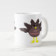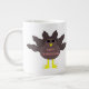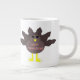 Cette énorme tasse présente un dessin d'une dinde aux grands yeux noirs, un petit bec jaune et des plumes de queue qui s'accrochent. Les pieds sont orientés dans des directions opposées, ce qui rend la dinde un air de nid. La dinde a du texte rose sur son ventre qui dit "Bon thanksgiving" et on dirait que les plumes ont été arrachées pour révéler le message.