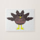Ce puzzle impressionnant présente un dessin d'une dinde aux grands yeux noirs, un petit bec jaune et des plumes de queue qui s'accrochent. Les pieds sont orientés dans des directions opposées, ce qui rend la dinde un air de nid. La dinde a du texte rose sur son ventre qui dit "Bon thanksgiving" et on dirait que les plumes ont été arrachées pour révéler le message.