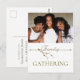 Apportez votre famille pour le dîner avec cette carte postale et cette invitation modernes. Modèle photo en haut sur la typographie de "Family Gathering" sur le devant. Modèles de texte à l'envers.