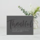 Cette invitation à dîner Thanksgiving en noir et blanc présente un script de brosse audacieux "reconnaissant" ainsi qu'une typographie moderne pour les détails de votre fête. Cette invitation est coordonnée avec la collection Lea Delaveris Design Thanksgiving. Le fond est un noir tacheté.