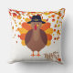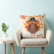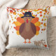 L'oreiller est montré avec des feuilles d'automne et un imprimé de dinde Thanksgiving sur un arrière - plan blanc. Customisez ce coussin ou achetez tel quel.