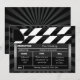 Cartes de Save the Date uniques pour nos cartes de mariage, l'invitation à la fête du clap de cinéma est idéale pour un thème de cinéma centré sur Hollywood et l'industrie cinématographique. Cartes de save the date personnalisées, en noir et blanc. Des rayons de lumière noirs et blancs élégants à l'arrière-plan Personnalisez le tableau noir du clap avec vos informations de mariage.