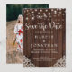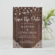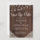 Annonce de mariage avec guirlande lumineuse en bois rustique et dentelle Mariage Save the Date avec une photo, avec un fond en bois rustique avec des guirlandes lumineuses scintillantes et de la dentelle de style vintage dans les coins inférieurs. Les mots "Save the Date" sont mis en valeur avec une typographie élégante mais rustique, ce qui fait de ce design le parfait choix pour votre mariage bohème ou champêtre. Ajoutez votre photo au verso pour l'annonce parfaite de votre nouvelle excitante !