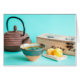 Thé pour une personne avec théière en fonte, thé en argile fait main, boîte à thé et deux scones au fromage.