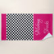 Serviette de plage avec design à damiers noir et blanc avec rose fuschia qui peut être changée à n'importe quelle couleur de votre équipe de course, texte peut être personnalisé ou texte est amovible.