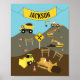 Illustration mignonne d'un chantier de construction et thème de camions. Les véhicules de transport de camions de construction comprennent le camion à benne, la pelleteuse, la rétrocaveuse, le bulldozer, la grue et le chargeur frontal. Le design parfait pour les garçons et les filles amateurs de camions et de machines lourdes. Idéal comme cadeau de Noël, cadeau d'anniversaire, décoration de nurserie, art pour chambre d'enfants, décoration intérieure ou rentrée scolaire. Personnalisez le nom et faites-en votre propre.