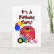 Invitations d'anniversaire à la ferme et aux tracteurs avec une grange de foin rouge, un tracteur bleu, des ballons, des animaux de ferme, et texte qui dit "C'est une fête d'anniversaire !". Nous avons aussi les T-shirts d'anniversaire assortis et l'affranchissement!