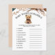 Ajoutez du rire et de l'humour au Baby shower avec notre "Rustic Bear Theme Baby shower Word Scramble Game". Les invités auront beaucoup de plaisir à compléter la liste des mots sur cette carte, tous liés aux bébés, qui peuvent les débrouiller d'abord! Obtenez la vôtre aujourd'hui, et créez des souvenirs inoubliables! Solution : 1. formule 2.pacifer 3.baby moniteur 4.rocking chair 5.swaddle 6.diaper raple 7.caoutchouc canky 8.stroller 9.playpen 10.eosines