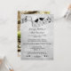 Une réception de mariage romantique en noir et blanc uniquement, carte de faire-part après ou après le mariage avec deux oiseaux chanteurs sur un design à thème musical avec un fond en dentelle grunge.