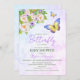 invitations à la douche bébé à thème papillon doux et estival. Avec un beau bouquet de fleurs d'aquarelle et de papillons pastel.