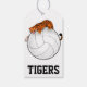 étiquettes cadeaux imprimées avec une mascotte tigre accroupie sur un volley-ball avec le mot TIGERS en bas. Modifiez le texte d'une balise personnalisée.