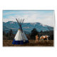 Image d'un Amérindien et de son cheval près d'un tipi. La neige s'est installée sur les versants supérieurs des montagnes de l'arrière - plan.