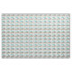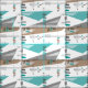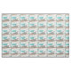 Tissu motif abstrait moderne du milieu du siècle composé de rectangles et de triangles aux couleurs turquoises, marron et vert gris sur un arrière - plan blanc.