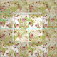 Petites échelles de fleurs dessinées libres, feuilles et tourbillons sur des parcelles de taches tan vert-citron, éclaboussures blanches et tourbillonnantes