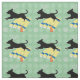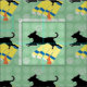 Une silhouette d'ombre noire d'un chien avec des oreilles et une queue volant saute en longueur. L'arrière - plan est vert avec une dispersion d'empreintes de pattes.