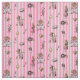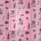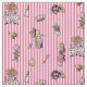 Les Motifs sont Alice, Reine des Coeurs, Soldats des Cartes, Mad Hatter, White Rabbit, Cheshire Cat, montre de poche, clé, couronne, potion, théière et roses sur arrière - plan rayé rose et blanc.