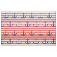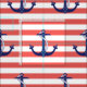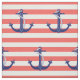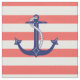 Ce tissu orienté nautique comporte une répétition des ancres de bleu marine sur un corail et un arrière - plan rayé blanc.