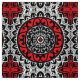 Tissu inspiré du sud-ouest/aztèque de conception de textile de batik dans un motif de cadran/mandala du soleil - tomate riche rouge, noir et blanc, accentué avec le gris argenté/gris