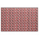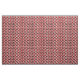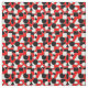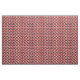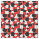 Ce tissu a une conception Bauhaus de triangles, cercles, rectangles et pentagons en noir et blanc sur un champ de rouge.