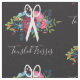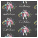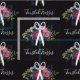 Tissu de coiffure fleurie en noir avec une paire de ciseaux blanche au sommet d'un joli bouquet de fleurs roses et bleues, baies bleues et orangées, grand rose bordeaux. Ajoutez votre nom d'entreprise dans un script charmant.