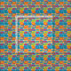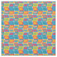 This fabric has a mid-century modern design of bright colors that make rounded rectangles with other rectangles inside formed by a collection of lines.