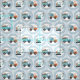 Joli matériel de construction avec un petit garçon en tête. Bleu et blanc avec des accents turquoise et orange menthe.