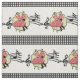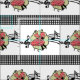 Ce design de tissu a un couple de danse carré habillé en costume rouge avec des symboles de musique derrière eux. La couleur de l'arrière - plan est blanche avec une bordure de chèque en noir et blanc. Cette conception est disponible dans d'autres mises en page et tailles.