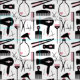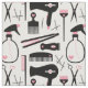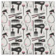 Tissu de coiffure dans un design rétro chic avec des outils de salon de coiffure en noir, rose et blanc avec de mignons petits coeurs.