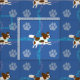 Style dessin Papillon sautant contre un arrière - plan de bleu avec des empreintes de pattes et des pistes en gris, rose et bleu.