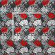 Tissu dans William Morris vintage, art Nouveau, impression florale des chrysanthèmes stylisés, numériquement augmentée et colorée, aux nuances du gris argenté /grey et du blanc, accentuées avec rouge-foncé, sur un arrière - plan foncé de gris de graphite