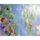 Water Lilies by French Impressionist Claude Monet. Monet did a series of 250 paintings featuring water lilis. The paintings depict his flower garden at his home in Giverny, and they were the main focus of his artistic production during the last thirty years of his life.