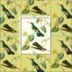 Deux colibris vert clair avec les masques protecteurs noirs et blancs sont perché sur une vigne tropicale avec les fleurs jaunes lumineuses. Montré sur un arrière - plan jaune-clair ; "personnaliser choisie il" pour changer la couleur d'arrière - plan.