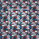 Des crânes blancs sont nichés parmi des fleurs rouges et blanches aux accents bleus sur ce magnifique tissu d'imaginaire. Idéal pour ceux qui embrassent Goth, mais se sentent plus clair, couleurs plus vives.