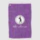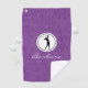 Silhouette noire de dame golfeuse dans un cadre rond blanc avec nom, sur un drap de golf imprimé en denim violet. Personnalisez le nom pour créer un cadeau de golf unique et garder saké. Modifiez le texte pour le rendre vôtre en utilisant le Modèle simple fourni. Dimensions : 16" x 24", 80% tissé polyester/20% polyamide mélangé microfibre, hameçon grommet et laiton inclus. Lavable en machine.