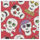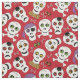 Ces crânes ont un peu peur et beaucoup de mignons ! Un pirate, un crâne effrayé par une araignée, des arêtes de croix, du maïs bonbon et des yeux colorés composent le motif sur ce tissu rouge d'Halloween. Art original © Anne Coffey.