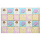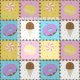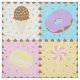 Satisfaites votre dent sucrée avec ce motif coloré qui propose de savoureuses friandises comme un cône de crème glacée au chocolat, un beigne de chocolat mauve, un macaron jaune citron, et une sucrerie tourbée rose et blanche séparée par des chips de chocolat et entourée de saupoudrées d'arc-en-ciel sur quatre carrés aux couleurs vives.