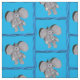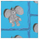 Un bébé éléphant est assis au centre de carrés qui sont échelonnés verticalement en rangées. Le carré est un cadre fait de "fil" bleu qui est plié en carré. Le fond est bleu clair. Jouet feutré à la main créé par Debbie Sue Stinson.