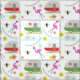 Motif avec illustrations de campeurs vintages rouges et verts, de flamants roses, d'abeilles, de brume et de motifs floraux.